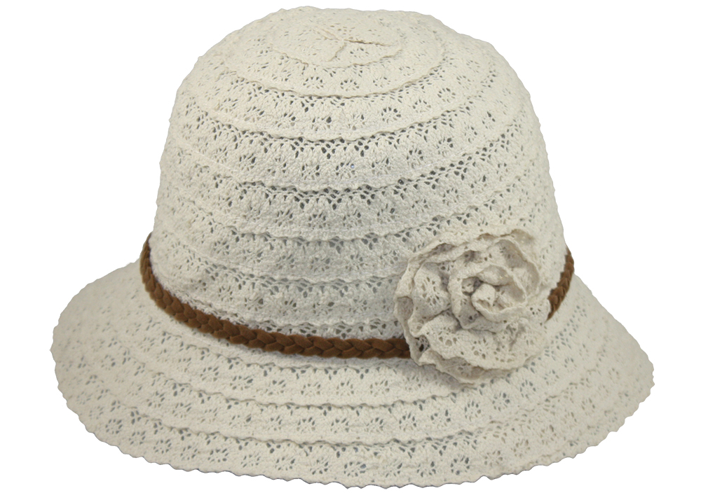 Women's Hat- CREAM- 50%cotton 50%polyester, bucket shape, brown tie around crown, 57cm
